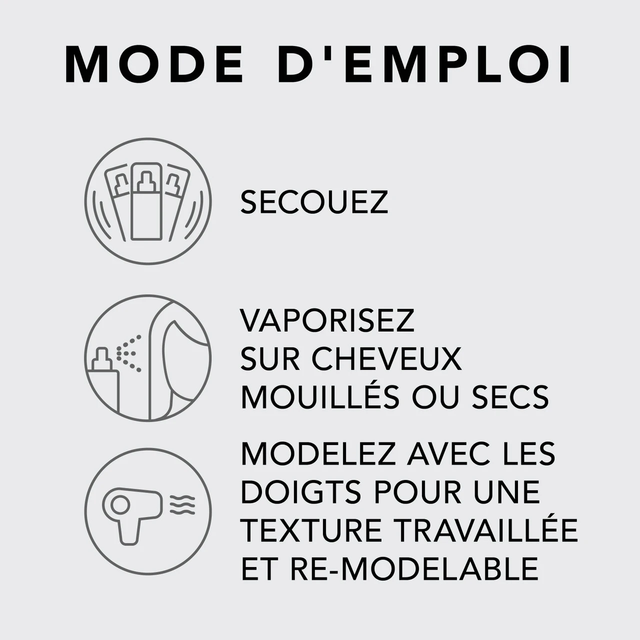 – Vaporisez sur cheveux humides avant de sécher au sèche-cheveux pour une tenue et une texture ébouriffée